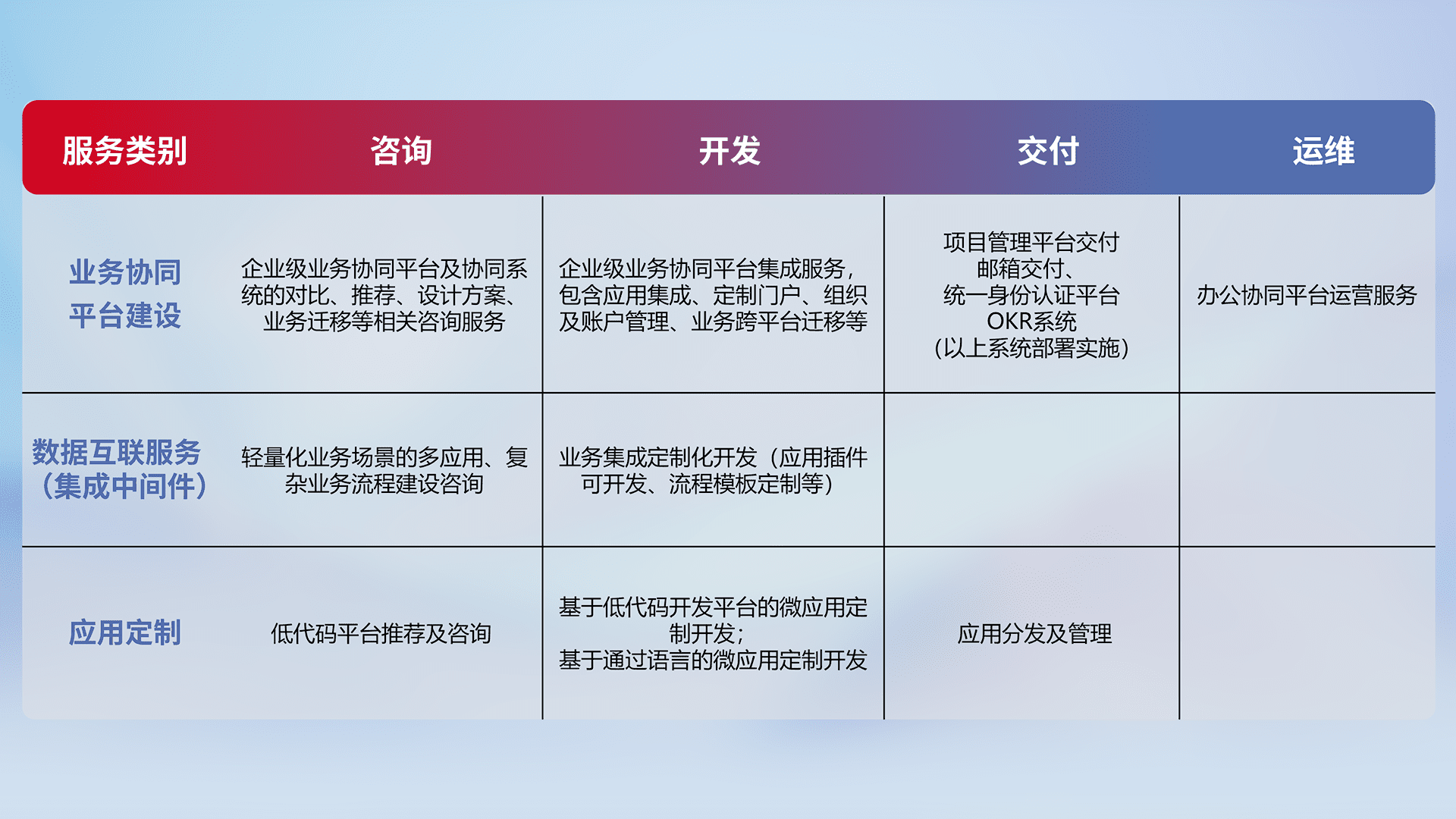 针对钉钉、、、、企微、、、IDaas等平台级产品提供产品的规划、、、方案、、、交付、、、、定制化开发等服务,,实现如统一协同办公、、智能客户服务、、、、混合会议管理、、、、智能数据查询、、等业务场景,,实现数字化转型。。。